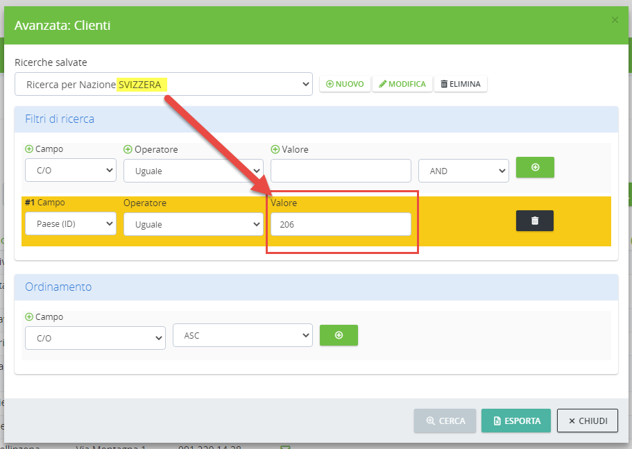 Quindi, ad esempio, per cercare tutti i contatti con la nazione Svizzera, di deve ricercare l'ID 206: