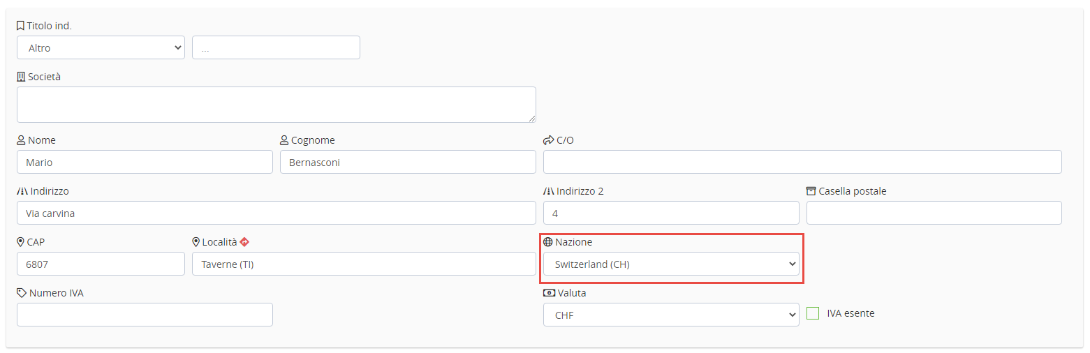 Il campo della Nazione/Paese, si comporta in modo un po' differente, dato che per cercarlo si deve indicare un ID e non il nome stesso della Nazione.