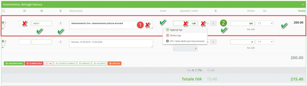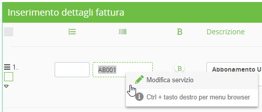 Input (codice articolo) con bordo tratteggiato in verde: context menu per modificare l’articolo.