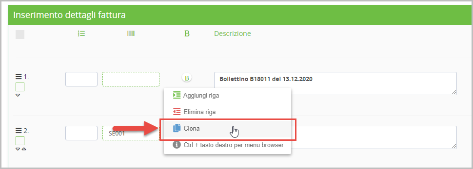 Dalla versione 3.4.0 è stata aggiunta la possibilità di clonare una riga nei documenti di vendita/acquisto