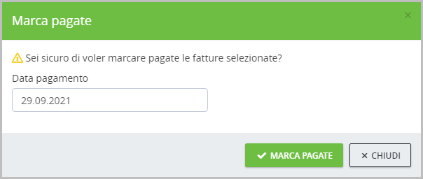 I passaggi sono come al punto precedente, con la differenza che una fattura non viene più marcata pagata con data odierna in automatico, ma si apre un modale che permette la selezione della data: