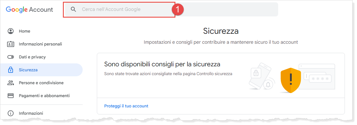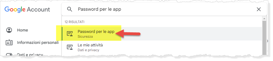 Per vedere la voce sotto indicata Password per le app dovete obbligatoriamente avere impostato la Verifica in due passaggi al punto precedente (vd. immagine seguente).