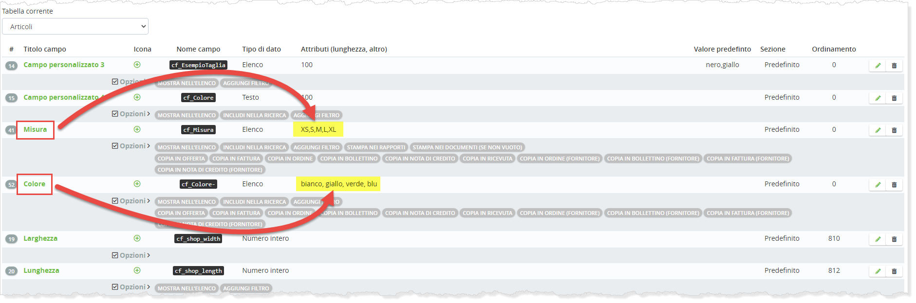 Nel nostro esempio creaiamo i 2 campi Misura e Colore: