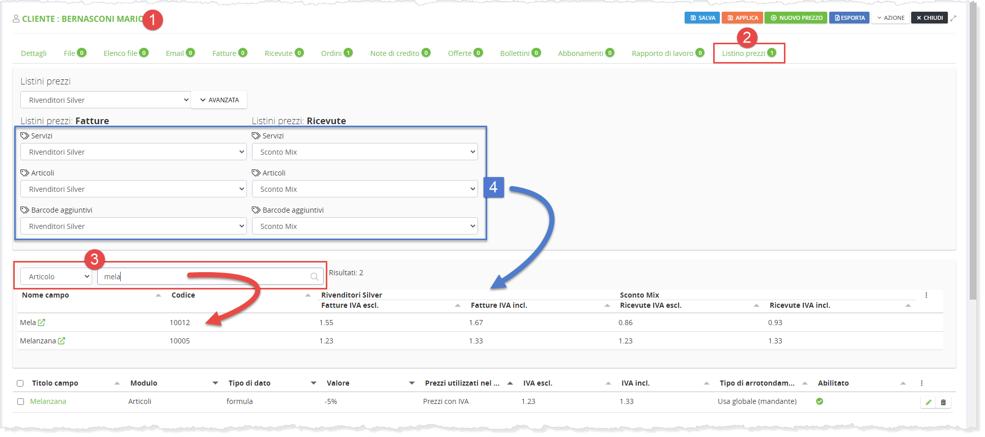 Dalla versione 3.5.1 è stata aggiunta una funzionalità di ricerca che permette di vedere a colpo d'occhio i prezzi degli articoli (soggetti quindi ai vari listini prezzi) per un contatto specifico.