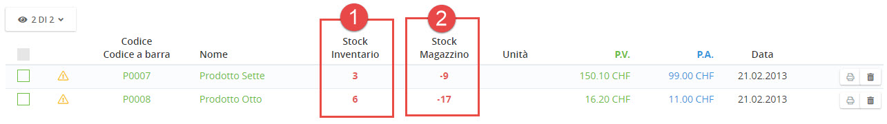 Lista degli articoli inseriti in inventario, con indicate le (1) quantità inventariate e le (2) quantità che risultavano in magazzino.