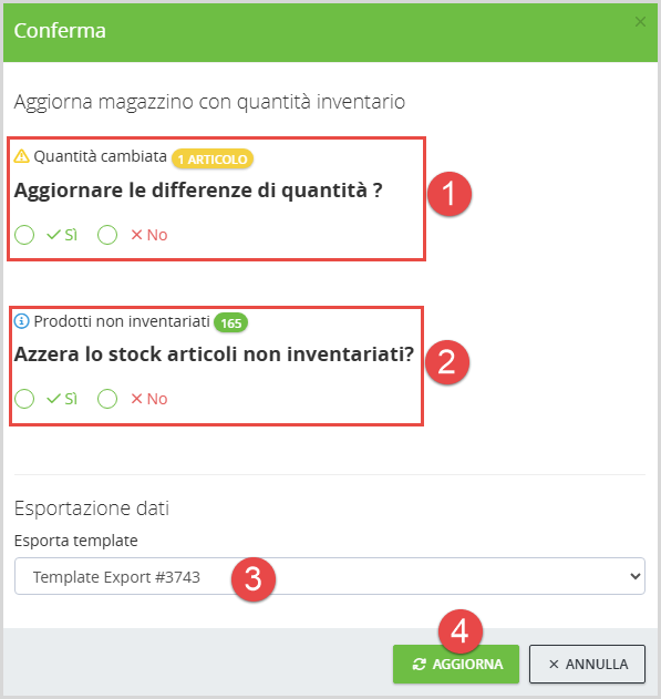 Aggiorna magazzino con quantità inventario » conferma finale per chiudere l’inventario corrente ed aggiornare lo stock: