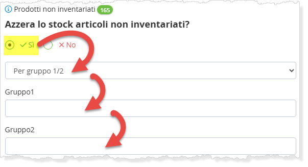 Si può dedicdere di azzerare gli stock di tutto, oppure di uno o più gruppi specifici di articoli (gruppo 1 e/o gruppo 2)