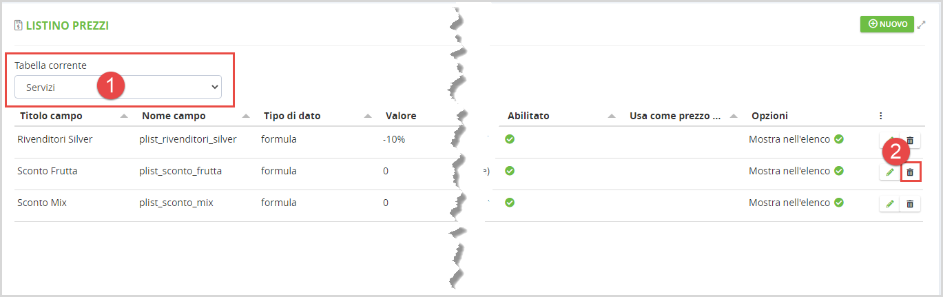 (2) Cliccare sull'icona per cancellare il listino solo per la tabella selezionata