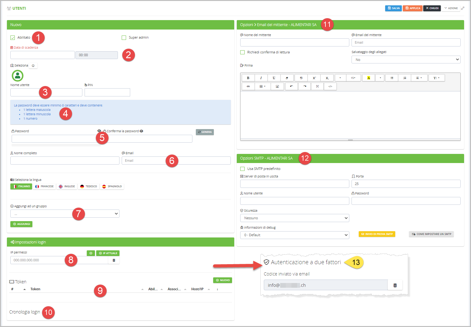 Quando viene salvato un nuovo utente, al momento del primo accesso, viene richiesta l'attivazione dell'autenticazione a due fattori tramite codice monouso (TOTP) oppure tramite codice inviato via email.