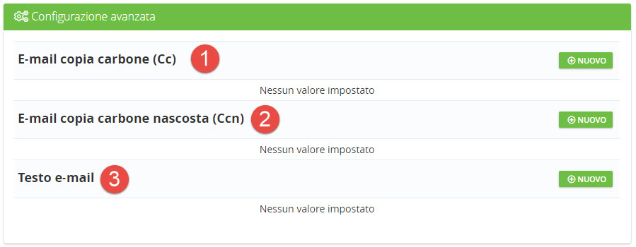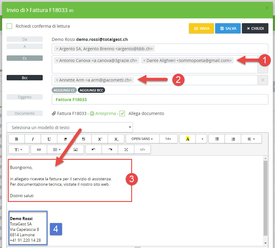 Le funzionalità in merito alle email in copia (Cc), copia nascosta (Ccn) e testi email, sono simili a quello spiegato al punto precedente » la cui lettura è consigliata.