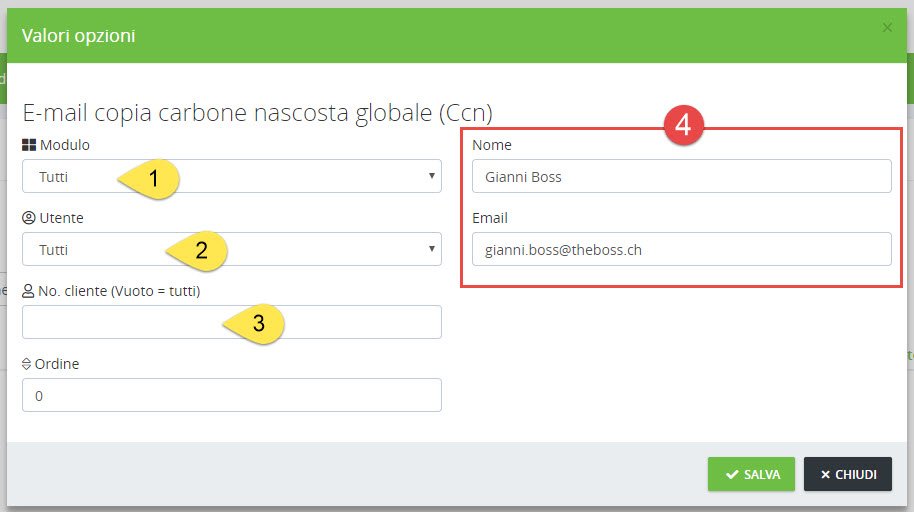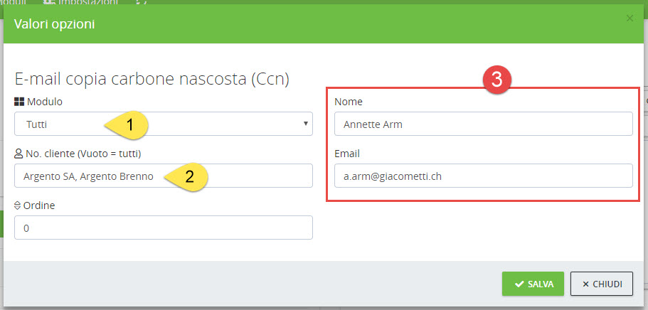 (1) Selezione del modulo per il quale vale questa impostazione. Si può quindi aggiungere un destinatario in copia nascosta (Ccn) solo per alcuni moduli specifici oppure per tutti.