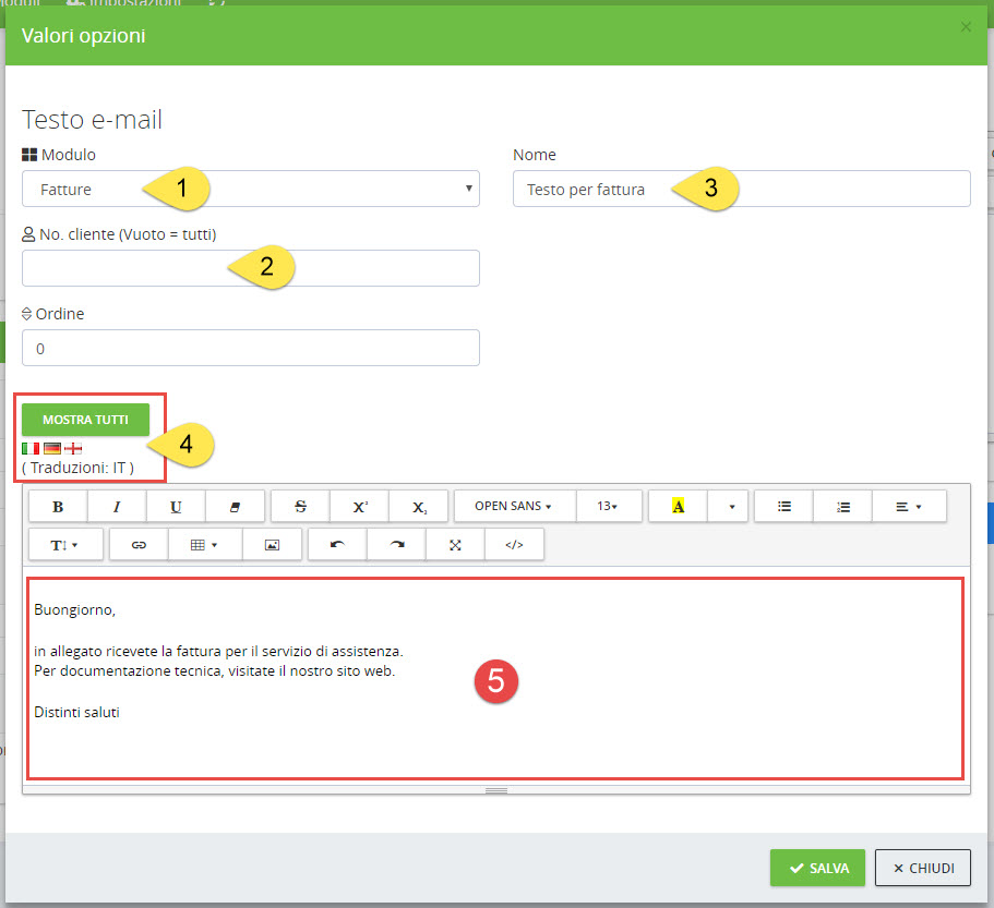 (2) Selezione del cliente per il quale vale questa impostazione. Si può quindi aggiungere un testo solo per alcuni clienti specifici oppure per tutti.