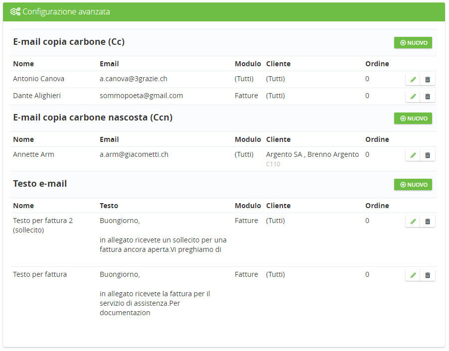 La funzionalità di invio di documenti via email può essere ampliata, impostando e inserendo in automatico dei destinatari in copia (Cc) che possono essere comunque tolti/eliminati in fase di compilazione dell’email.
