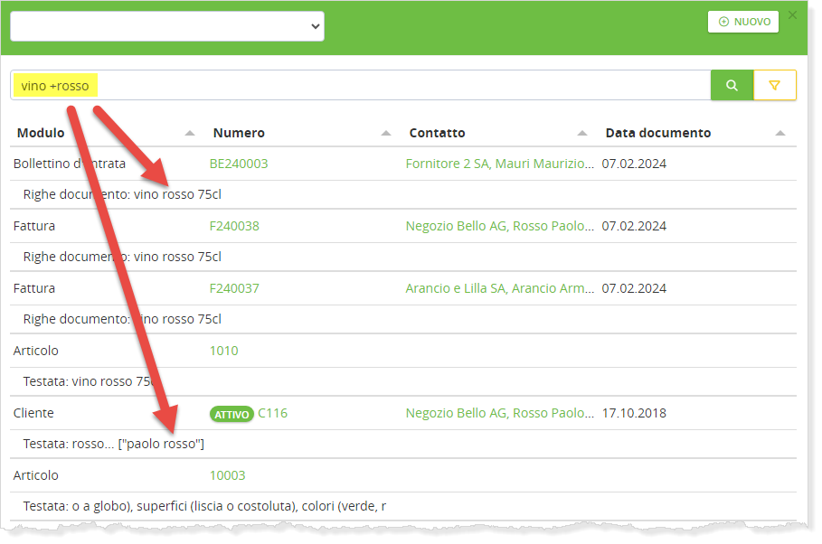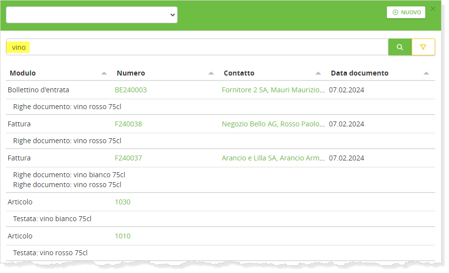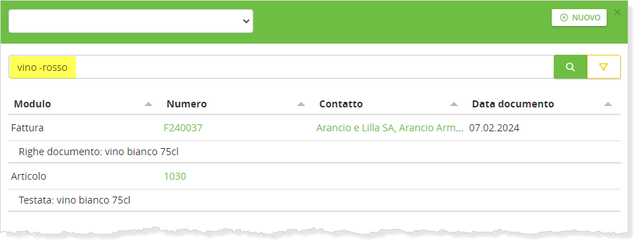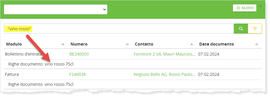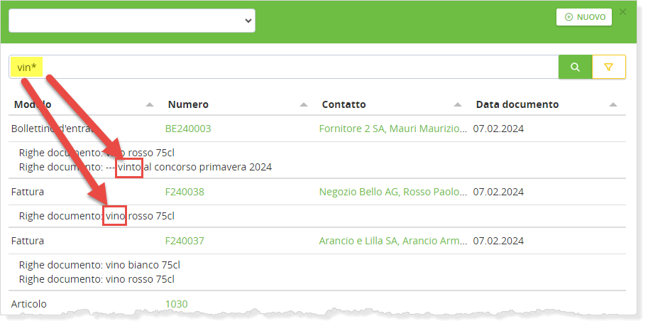 Cercando una termine specifico, vengono mostrati tutti i risultati che contengono la parola (esatta) vino