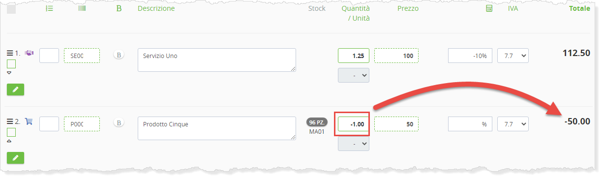 Ora, per indicare un reso, uno storno o semplicemente una deduzione sulla singola riga, questi devono essere indicati con un segno negativo nella colonna quantità.