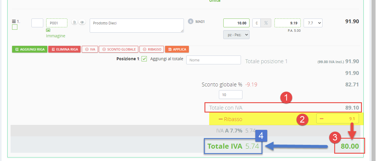 Applicato un ribasso, TotalGest a ritroso ricalcola i vari totali (importo netto ed IVA)